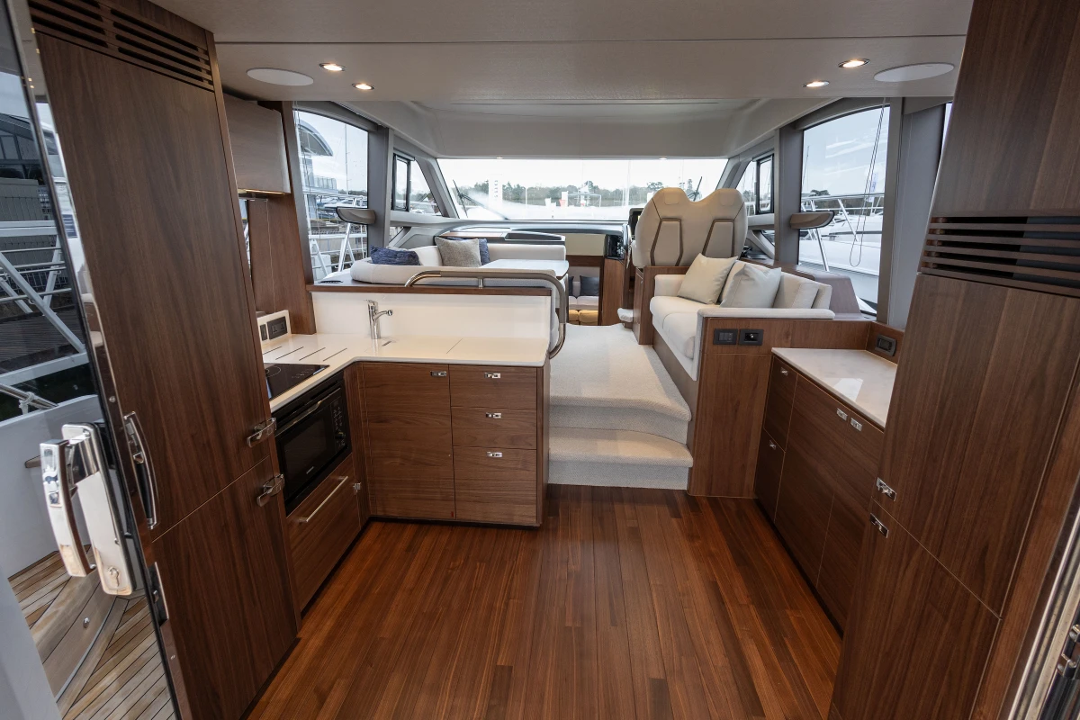 This model features a sociable cockpit leading through to the main saloon, with a galley aft, a large U-shaped sofa and a dining table for up to six guests. Head up to the flybridge to enjoy a spacious U-shaped aft seating area, twin helm seats and forward L-shaped seating. Guests are accommodated across three beautifully appointed cabins, two of which are ensuite. The forward cabin’s scissor berths offer complete flexibility for guests.