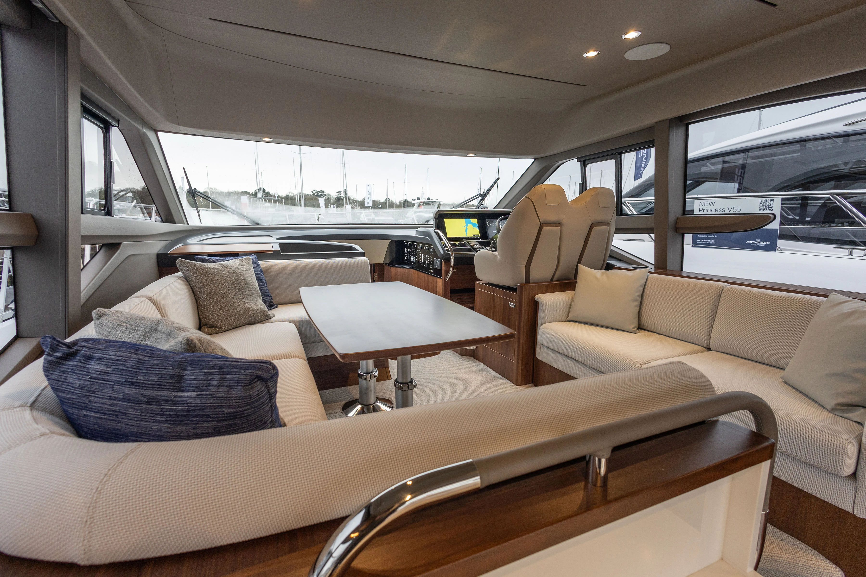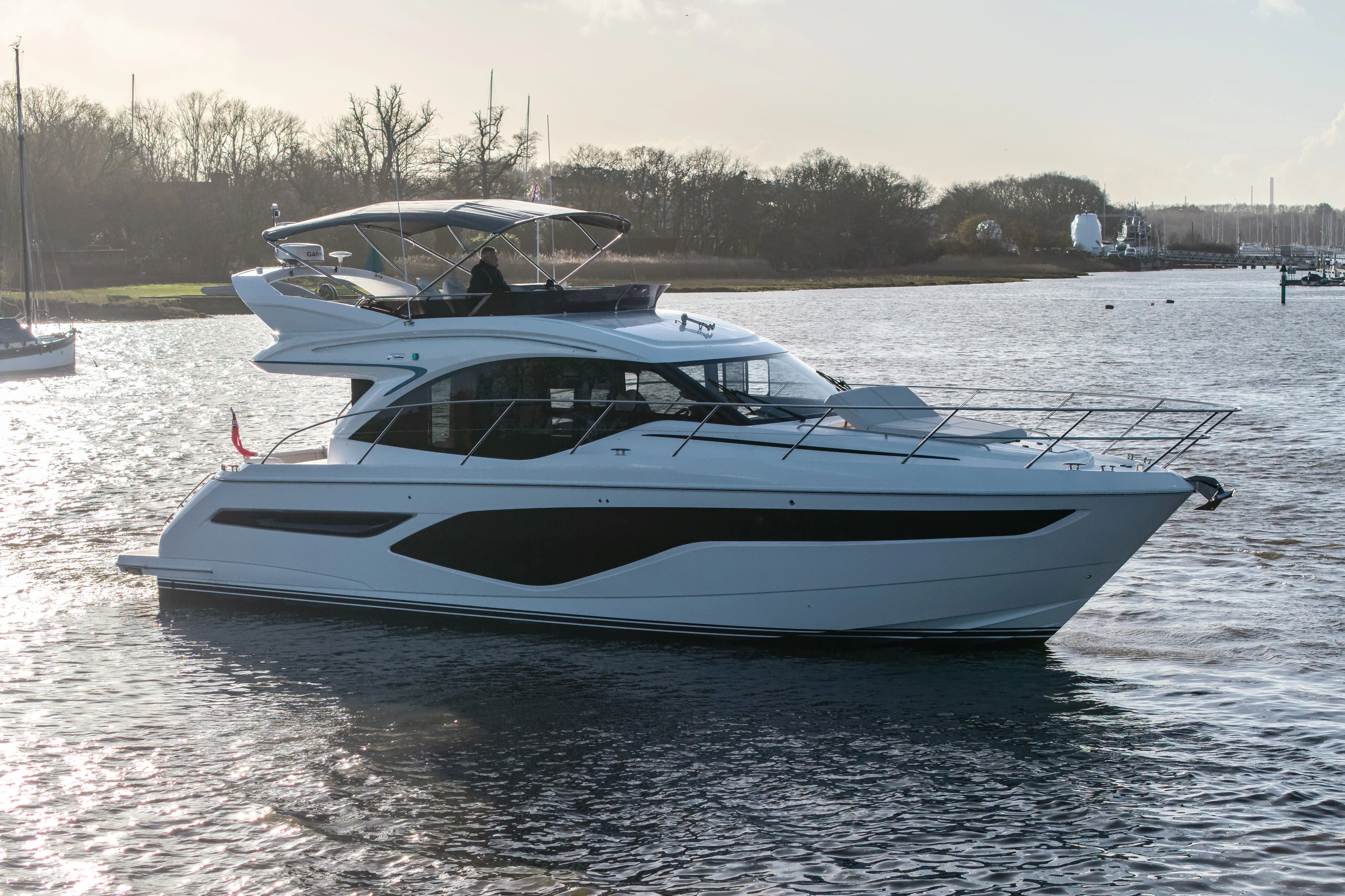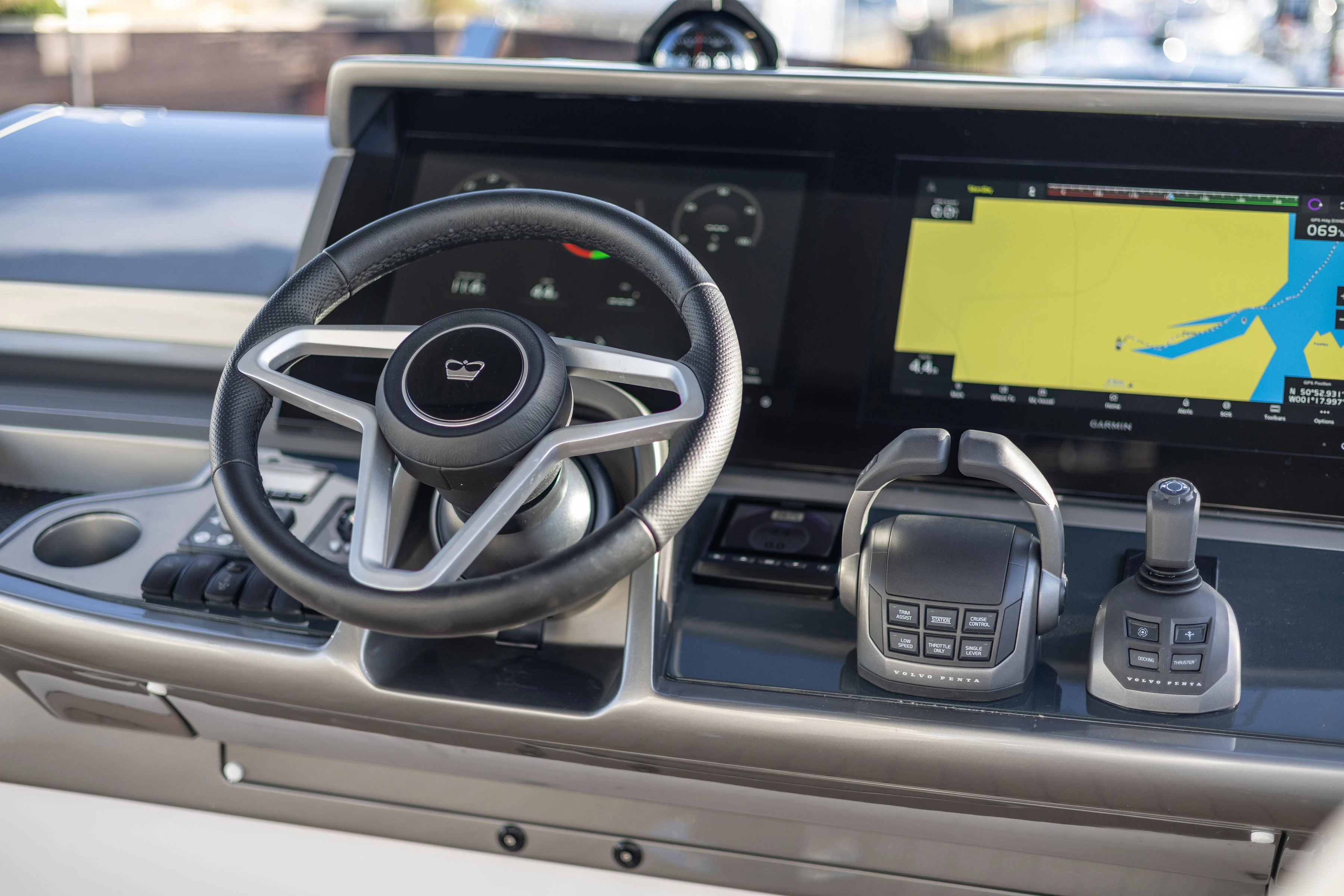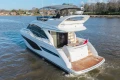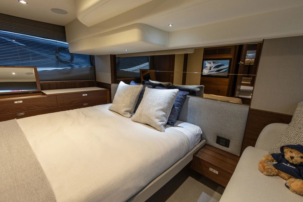 Twin Volvo IPS 800 (2 x 600 mhp) Engines • Bowthruster (120Kgf) with dual station controls • Volvo Automatic Interceptor trim tabs • Onan 11Kw generator • Walnut interior wood, satin finish • Deck saloon table with conversion to double berth • Electro-hydraulic transom platform • Scissor berths in forward cabin • Flybridge wetbar with sink, electric griddle/ BBQ and storage • Premium upholstery throughout • Stainless steel Lewmar Epsilon anchor • Dishwasher • Combination washer/dryer • Full-height fridge/freezer (270ltr) • Premium audio system with LED TV’s in saloon and accommodation • Onboard Wifi • Garmin GMR 24 xHD3 colour radar with 24″, 4Kw Radome • Reverse cycle air-conditioning/heating