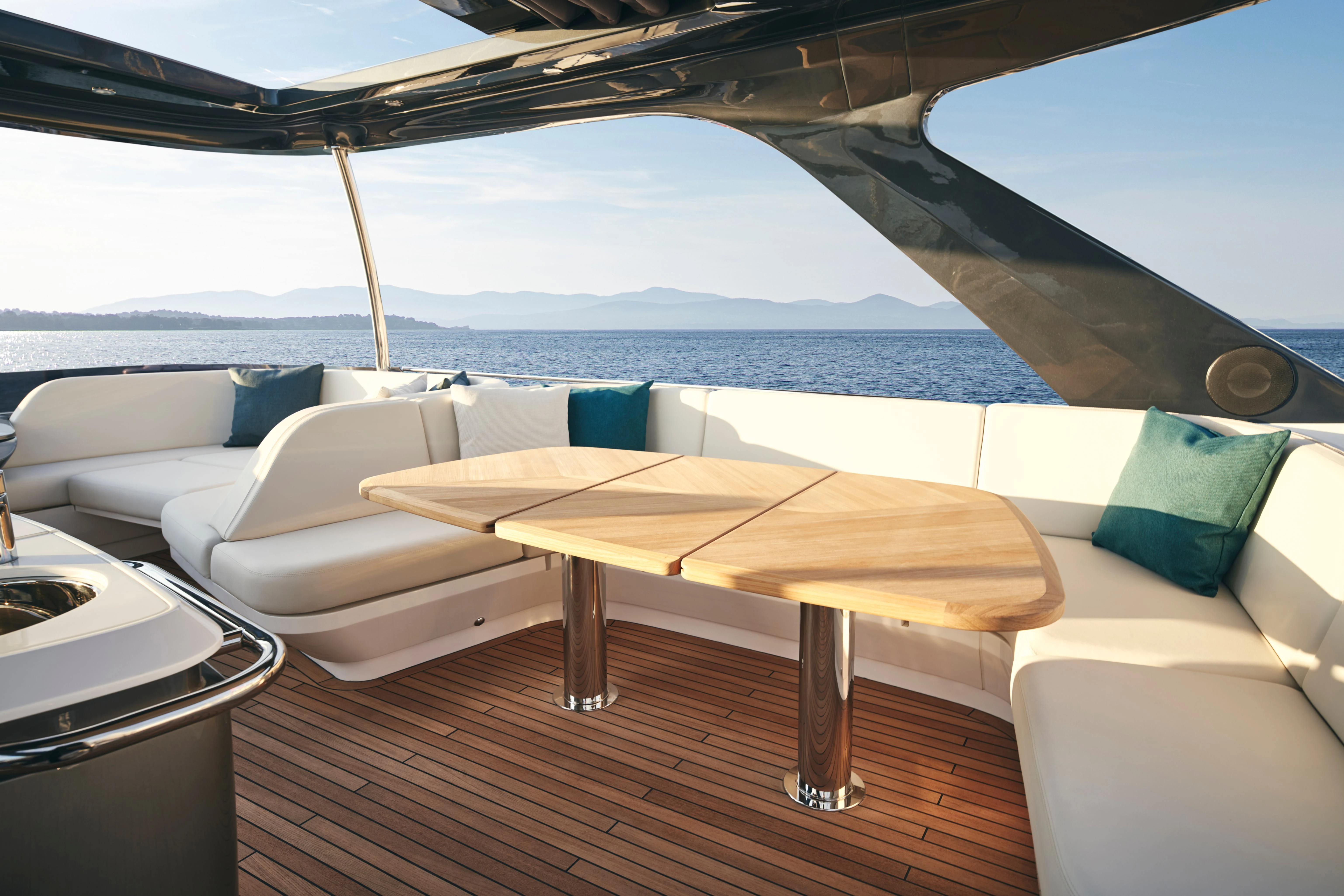 Her contemporary flybridge is the perfect outdoor entertaining area, with ergonomic dining seating, wetbar with barbecue, coolbox and sink, plus an aft sunbed and L-shaped companion seat with infill as a secondary sunbed.