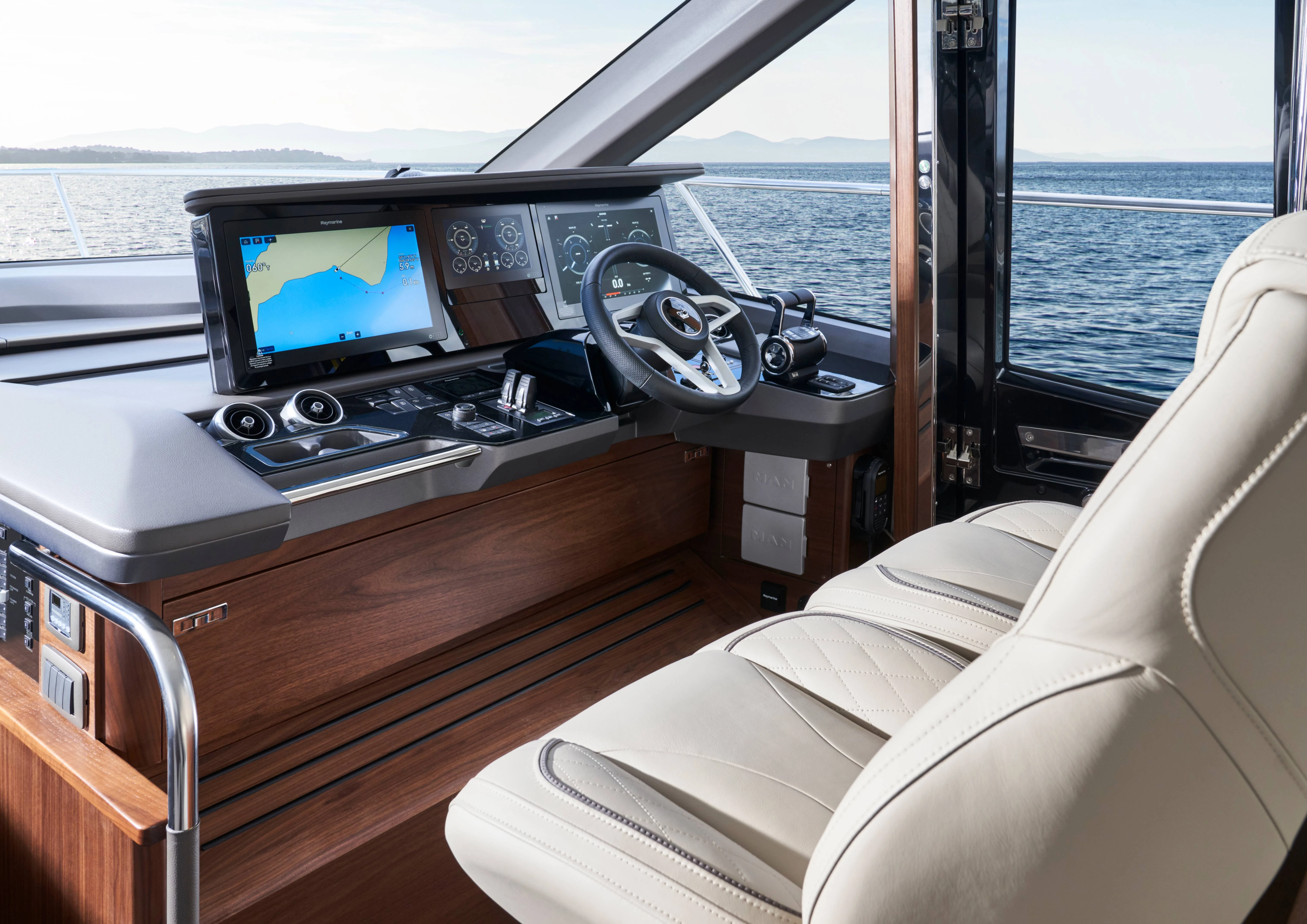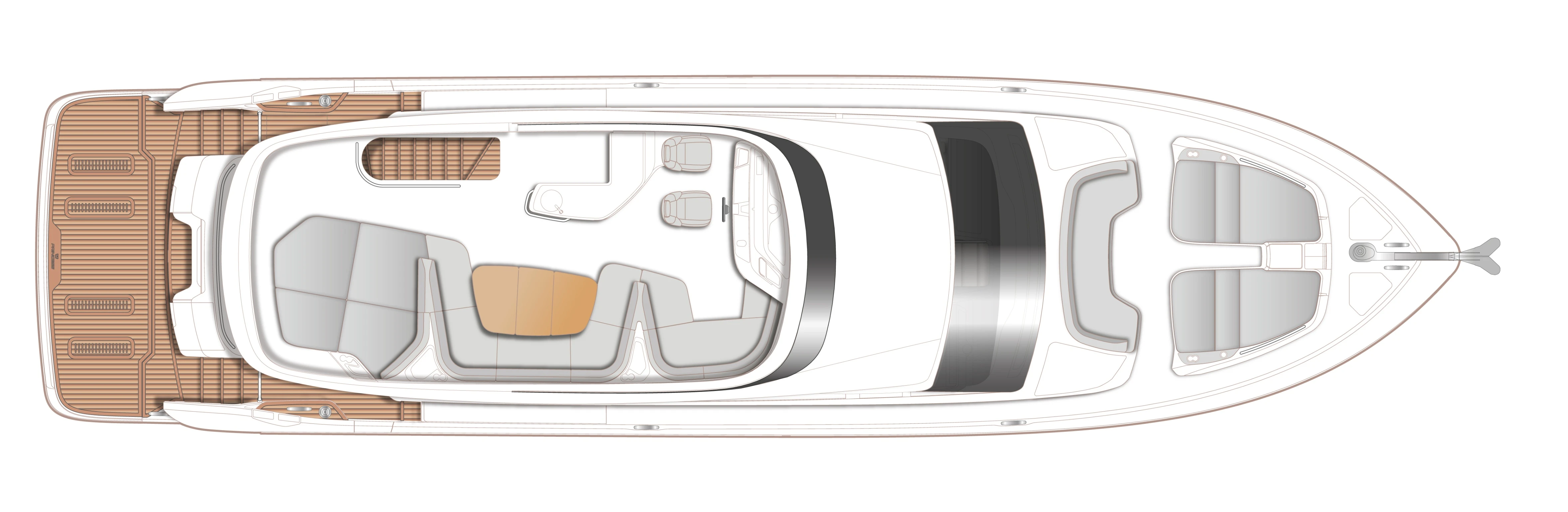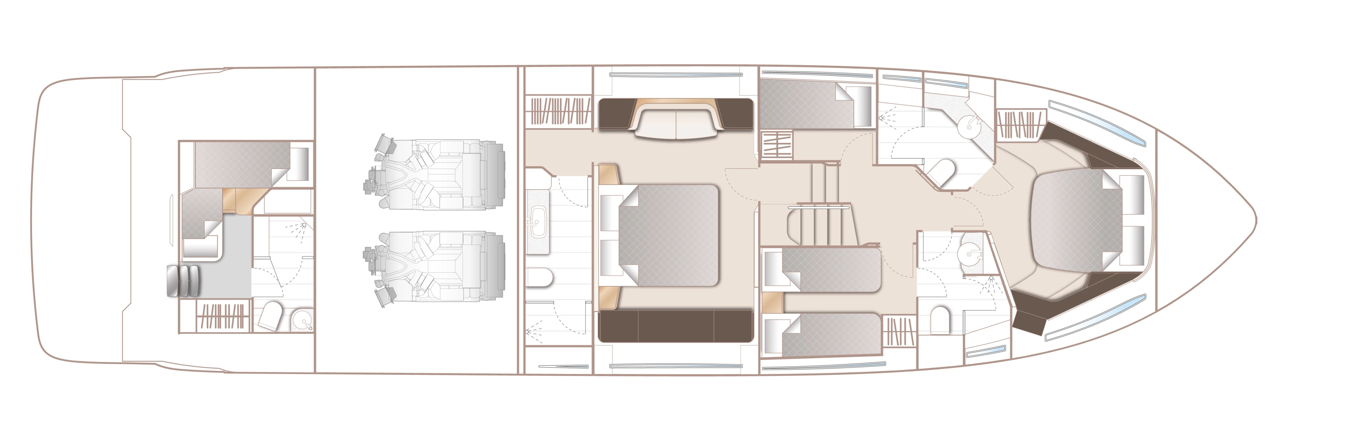 The expansive main deck is segmented into an aft galley with dinette, saloon with large U-shaped sofa plus companion seating opposite the helmsman area which features a side access door to the deck. The foredeck provides the perfect spot to enjoy outdoor relaxation with split sunpads and the ability to include an integrated cool box.