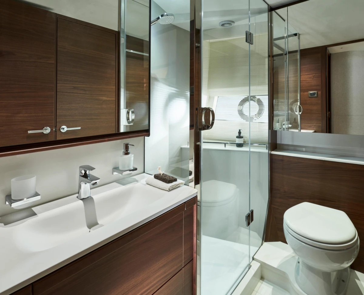 The Princess F65’s layout brings loved ones together. Focussed around a sociable use of space she provides accommodation for eight guests across four cabins. Vast panoramic saloon windows and signature wrap around front screens offer uninterrupted vistas from the main deck whilst elongated hull windows generously flood her accommodation areas with light.
