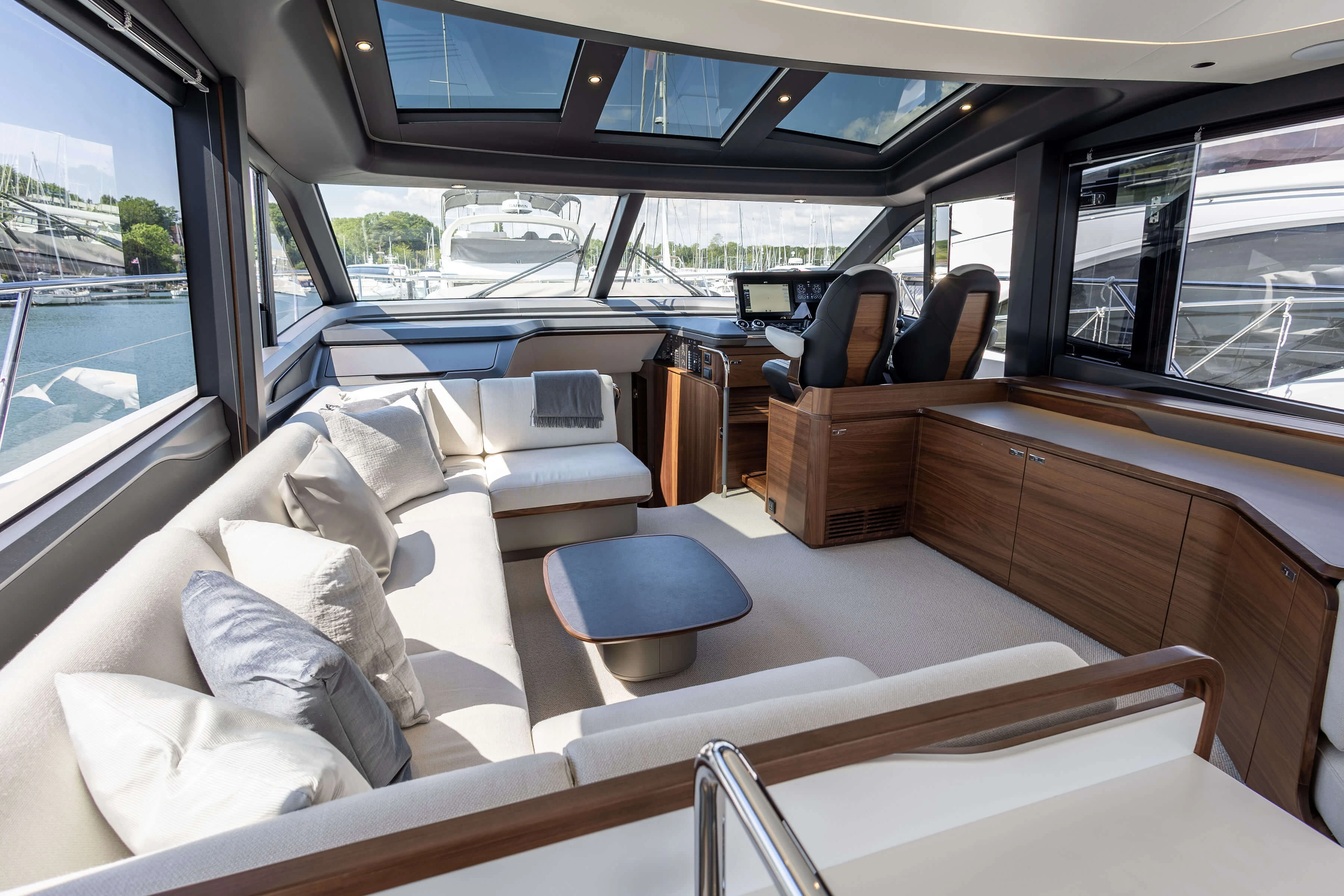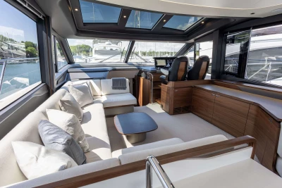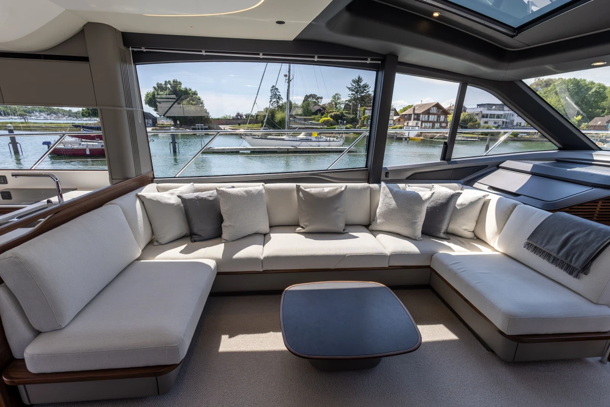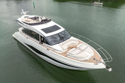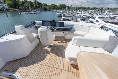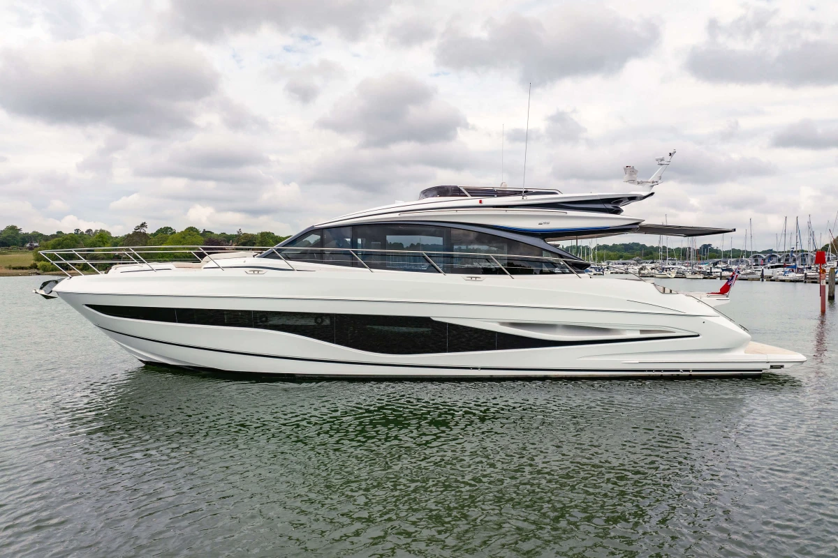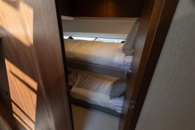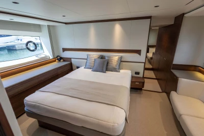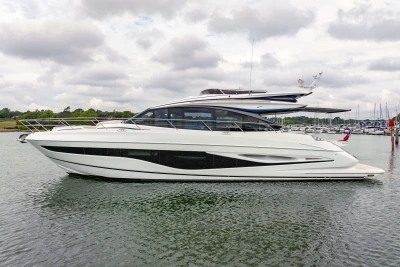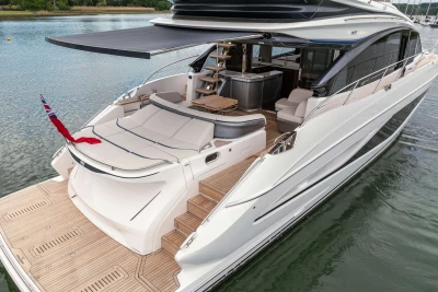 Twin MAN V12-1400 engines (2 x 1400mhp) • Walnut interior wood, satin finish • Seakeeper 18 Gyro stabilisation • Variable speed (eVision) bow and stern thrusters with hold-function docking facility • Princess Connect Telemetry & Maintenance System • Teak laid decks • Electrically operated sun awning to aft end of cockpit • Electro-hydraulic telescopic passerelle with automatic handrails • Teak laid decking • Electric stern rope handling winches • Williams 345 tender • Seabob storage rack • Dual Raymarine Axiom 2 XL 15.6″ colour multifunction displays at each helm • Onan 19kW generator • Premium Fusion audio packages with Focal speakers • Onboard wifi network • Starboard twin cabin with sliding conversion to double berth • Aft cabin fitout • Reverse cycle air-conditioning/heating