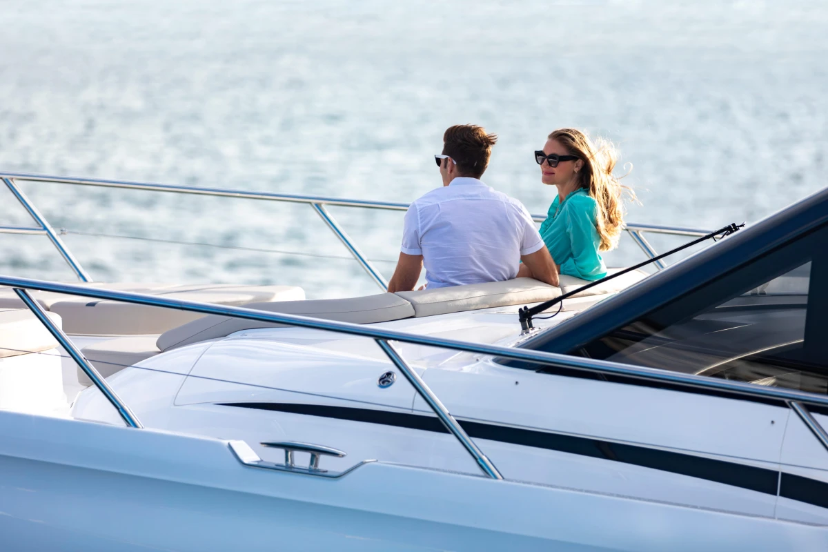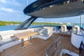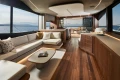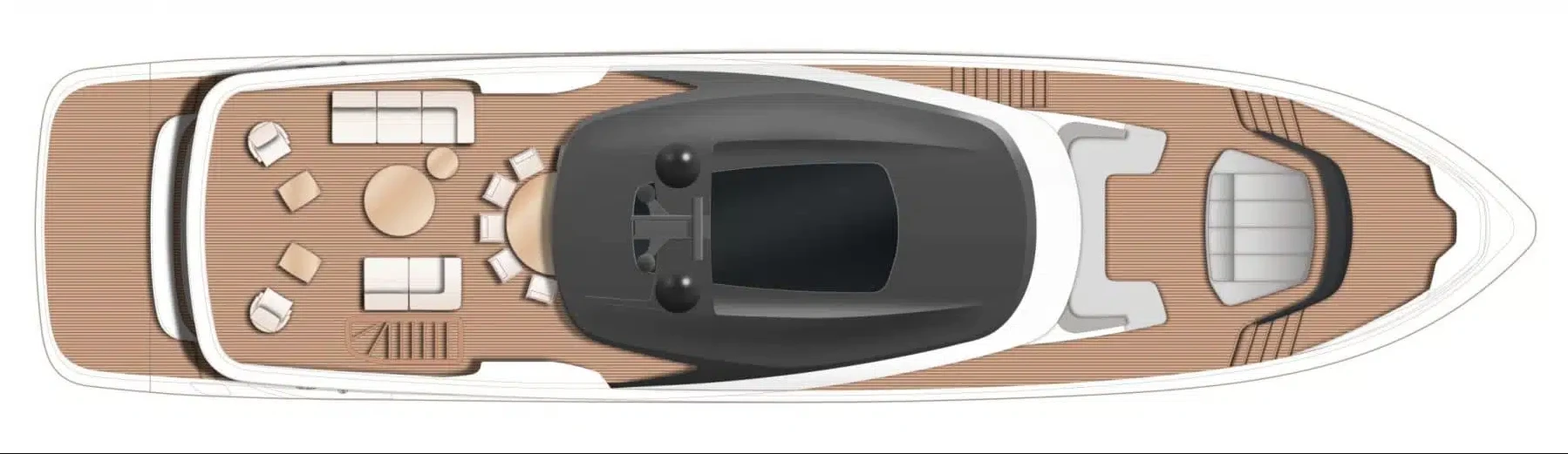 The spacious foredeck boasts innovative sunbeds with integrated adjustable headrests, which can be converted to create additional aft facing seats, whilst a locker between the sunbeds can be specified as an additional cool box. The stern houses a generous garage and can comfortably accommodate a 3.9m tender, creating the perfect base for watersports.