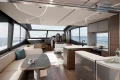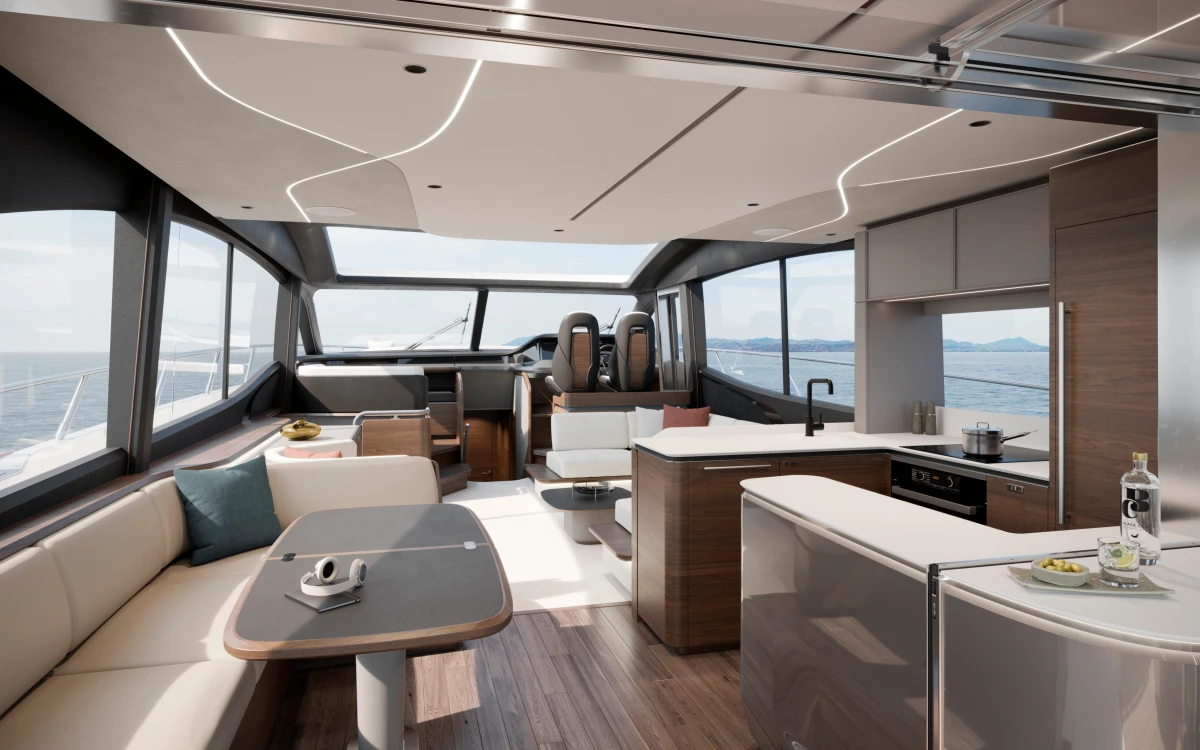 The cockpit features a unique U-shaped seating area with modular seating, folding teak table and servery unit – a place to entertain or just sit back and relax while enjoying the yacht’s exhilarating performance. The triple-sliding saloon doors create a harmonious connection between exterior and interior and the cockpit bar connects to the galley to create an almost seamless transition. A glass window partition folds up from the unit below to provide servery access when entertaining. Her cavernous main deck saloon with U shaped sofa is designed for sociable living. Using dynamic lines and convivial seating, she seamlessly connects to the world outside through full-length side windows. The fully equipped galley opposite the large L-shaped dining area, is perfectly place for hosting.
