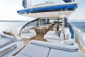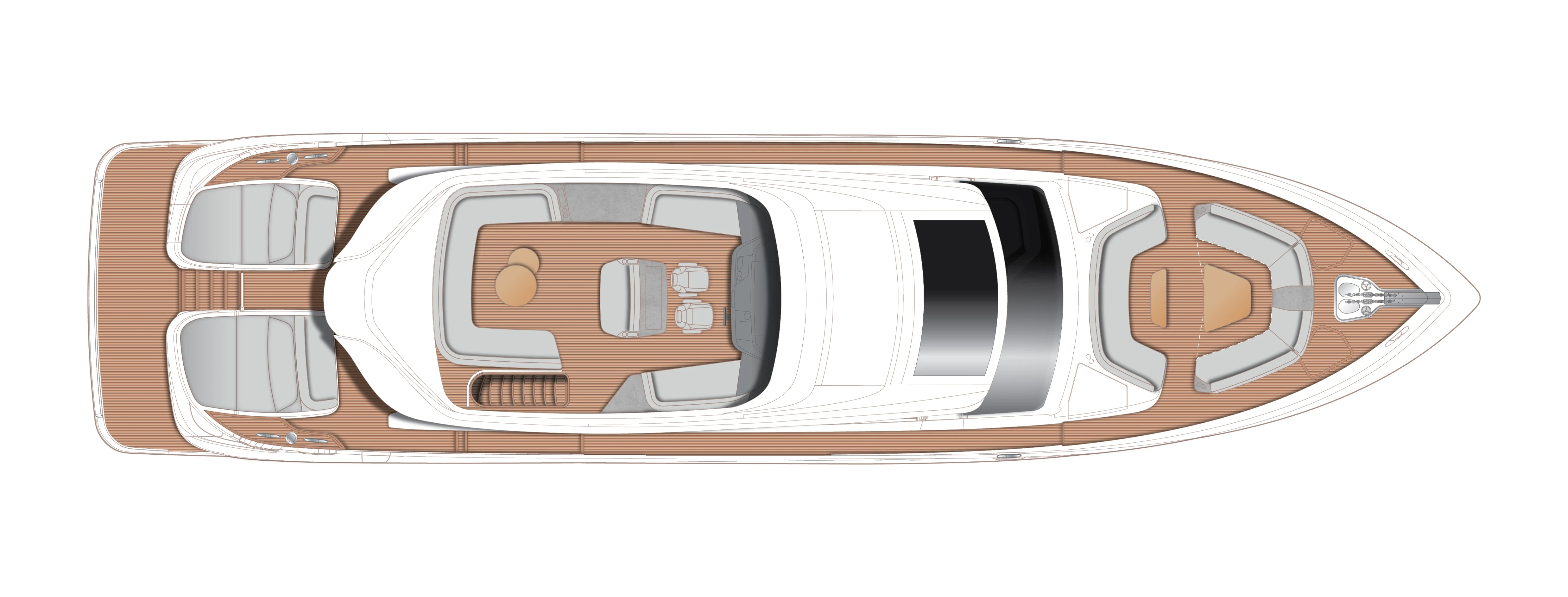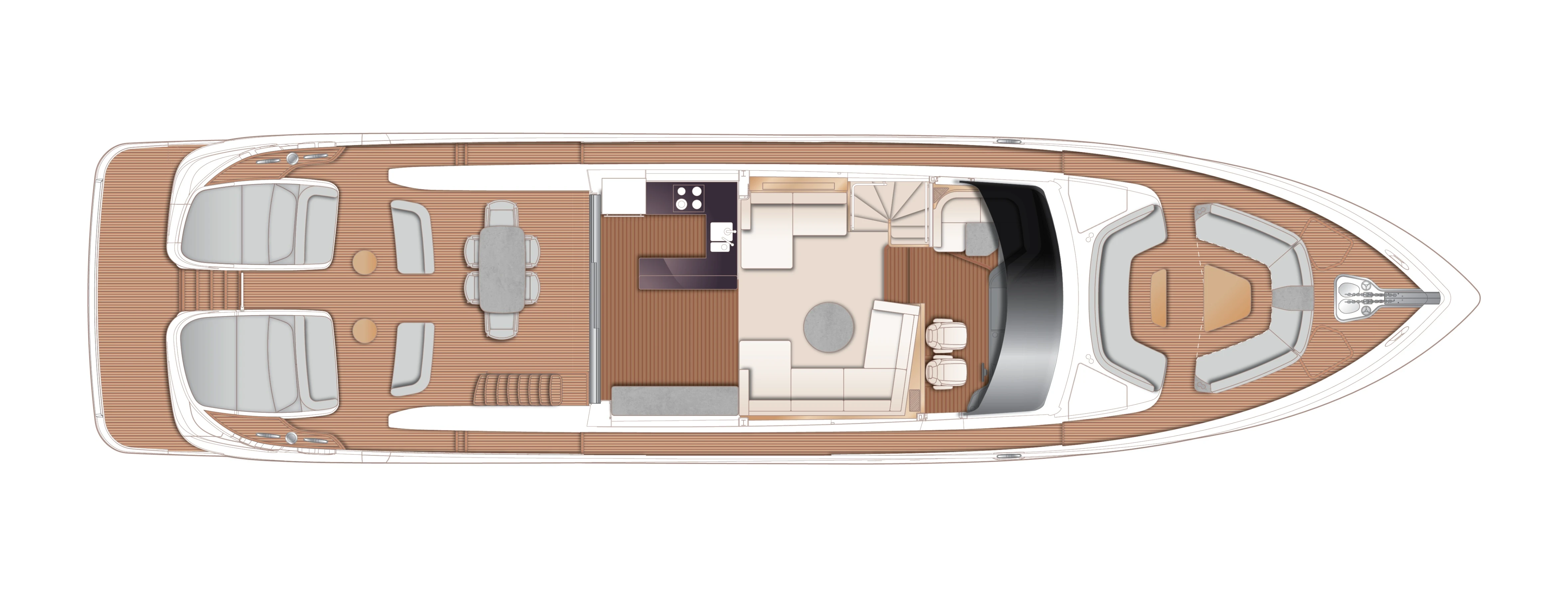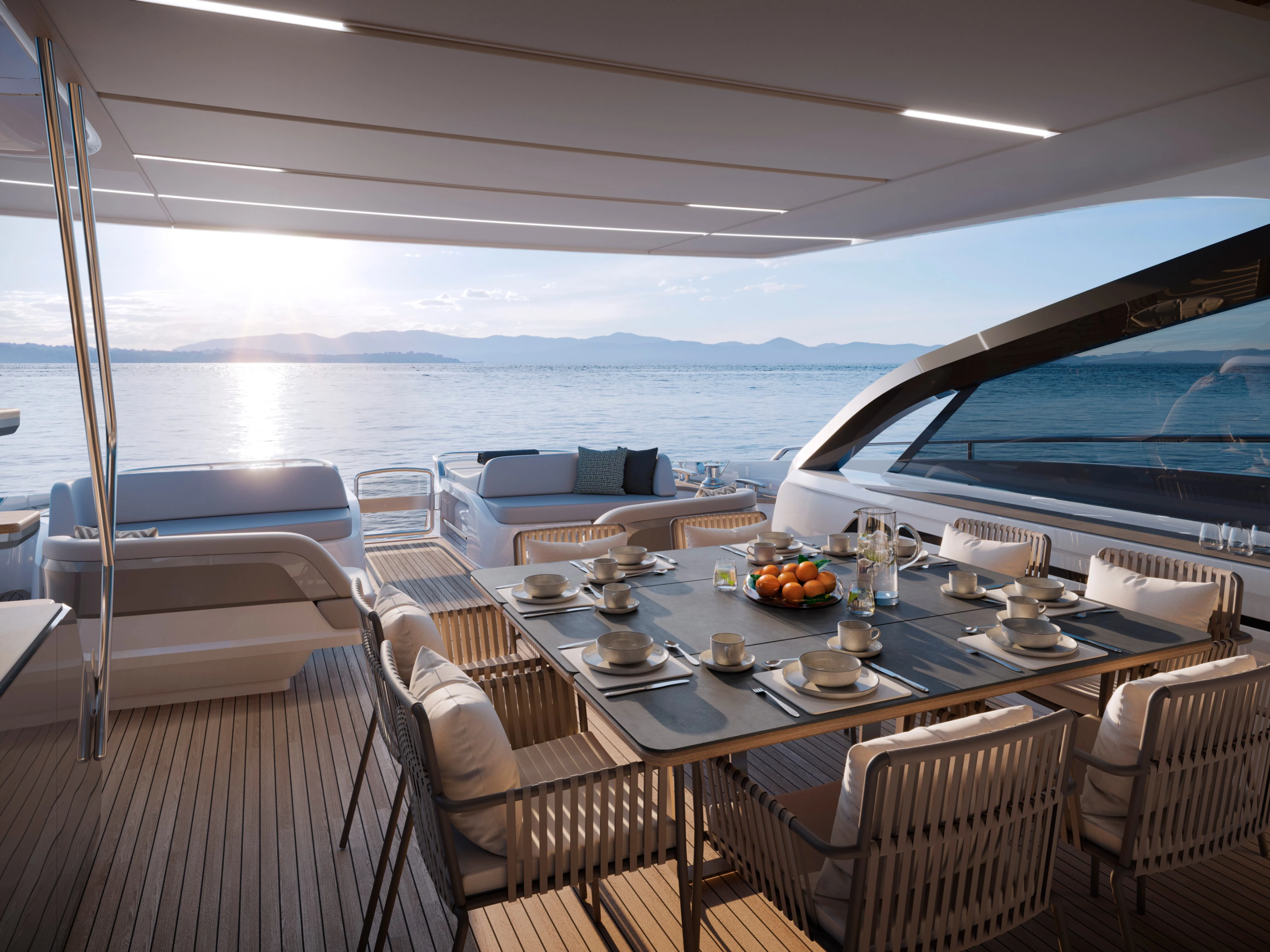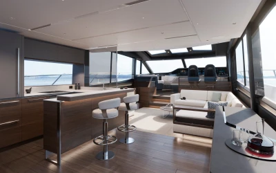 Full length windows flow along the main deck, extending either side of the cockpit canopy to provide a sheltered area from the sun. High bulwarks complete with oval stainless-steel rails, a vast teak laid deck, and tailored natural materials define the flagship status of this new S Class model, blending luxurious and contemporary finishes in perfect harmony.
