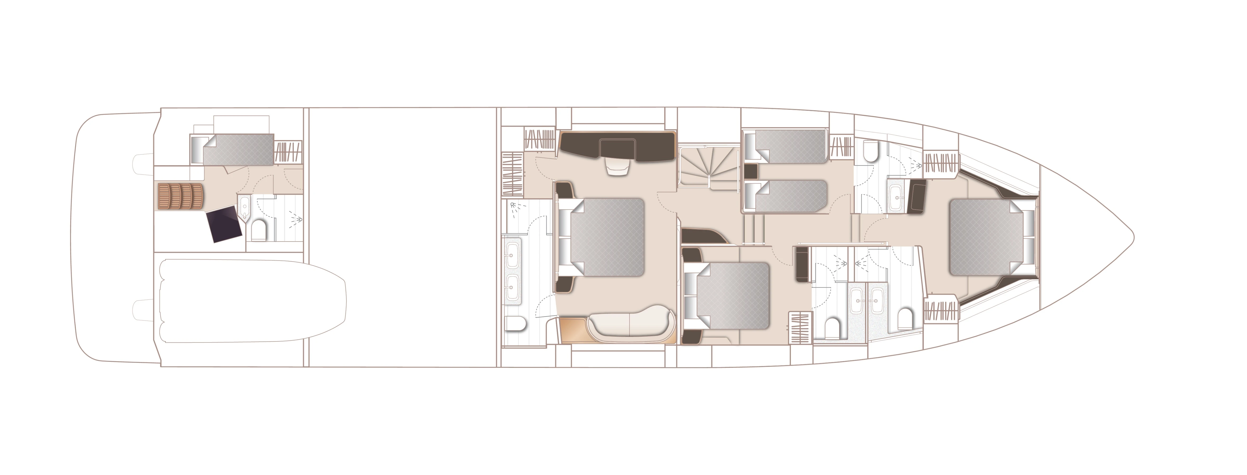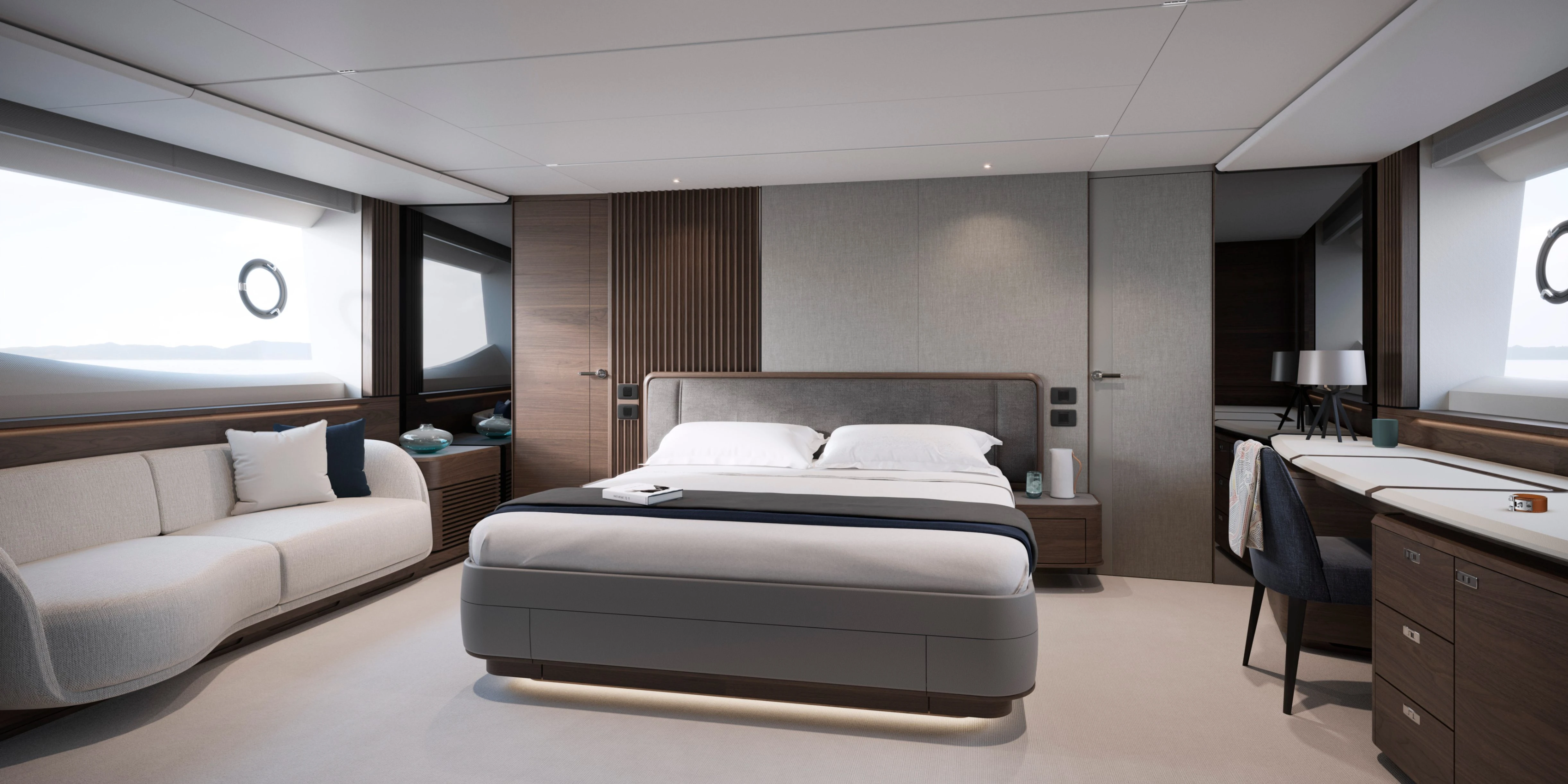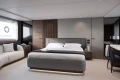 The S80 lower deck features four en-suite cabins complete with chilled water airconditioning and opening portholes for natural ventilation. The full-beam master stateroom features soft organic furnishings, complemented by accents and finishes of natural timber. Soft lighting features accentuate the curved forms of the hand-crafted furniture to create a contemporary but calming environment for owners.