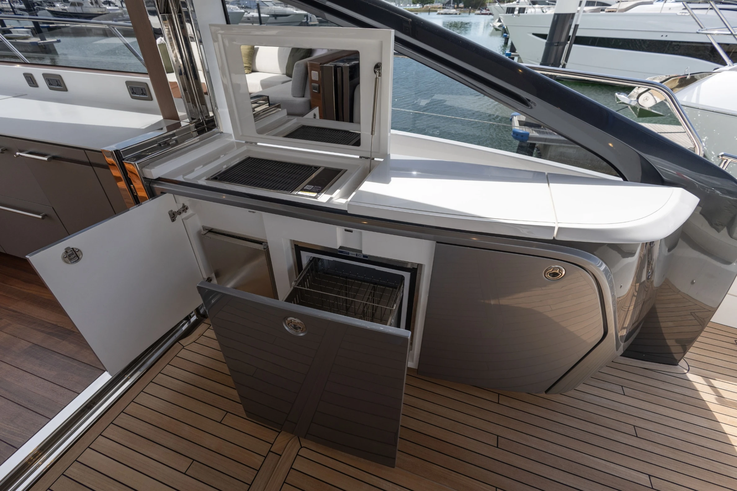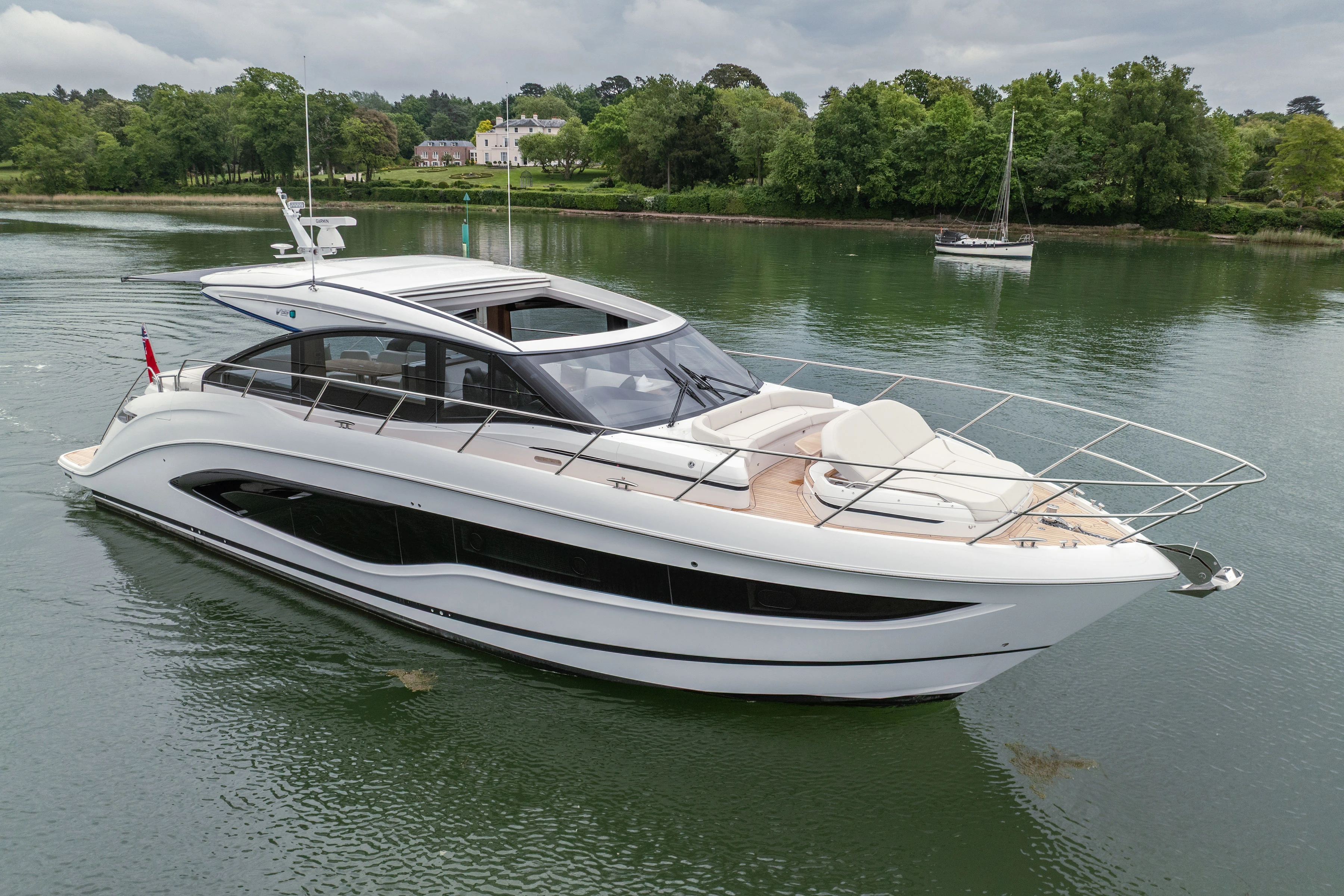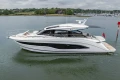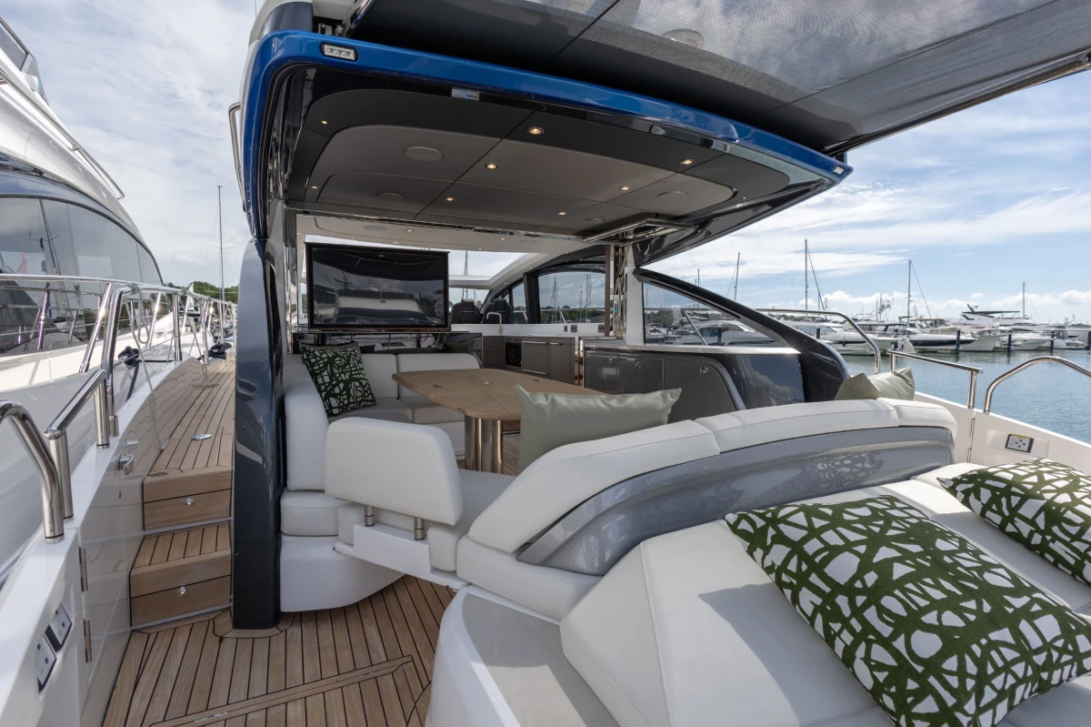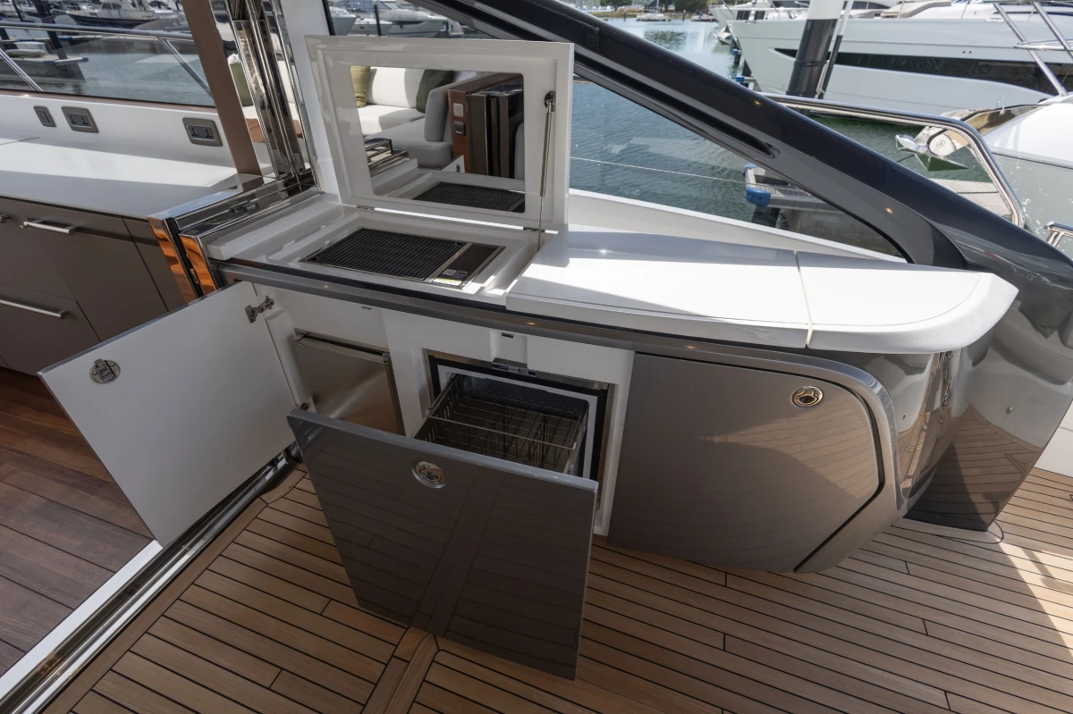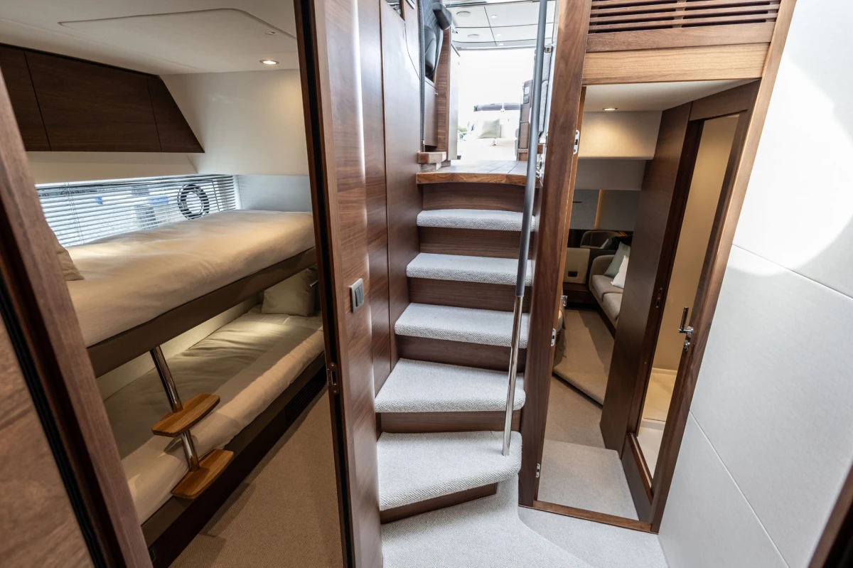Twin Volvo D13-1000 (2 x 1000hp) diesel engines • Volvo joystick control • White gelcoat hull • Walnut interior wood, satin finish • Three cabins accommodating six guests • Teak laid decks • Seakeeper 9 gyro stabilisation • Variable speed bow and stern thrusters • Saloon dining/coffee table with electrically operated leg mechanisms • Concealed galley storage unit with electric lift • Aft cabin fitout • Onan 17.5kW generator • Garmin 434 XHD3 radar • Reverse cycle air-conditioning • Underwater lighting • Electrically operated sun awning to aft end of cockpit in grey • Electro-hydraulic telescopic passerelle • Icemaker • Combination washer/dryer • Premium audio package • Onboard ethernet WiFi network