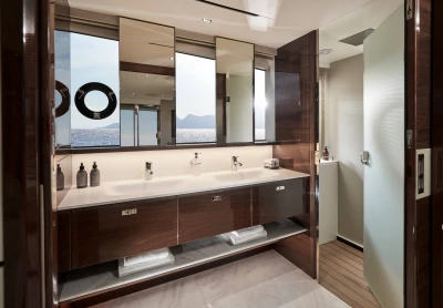 Her interior is just as captivating, with the outside welcomed in via the large windows which flow either side of the entire length of the main deck, encasing the saloon, galley and forward dining area. The use of natural and ambience lighting, innovative design and exquisite materials are combined here to create an idyllic space in which to while your time. Below deck, 8 guests are accommodated across 4 guest cabins, each with their own private en-suite. A full-beam master stateroom is located amidships, with the option to configure the main deck as above. Located aft of the main guest accommodation is the crew quarters which can accommodate 3 crew with the standard layout.