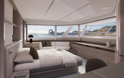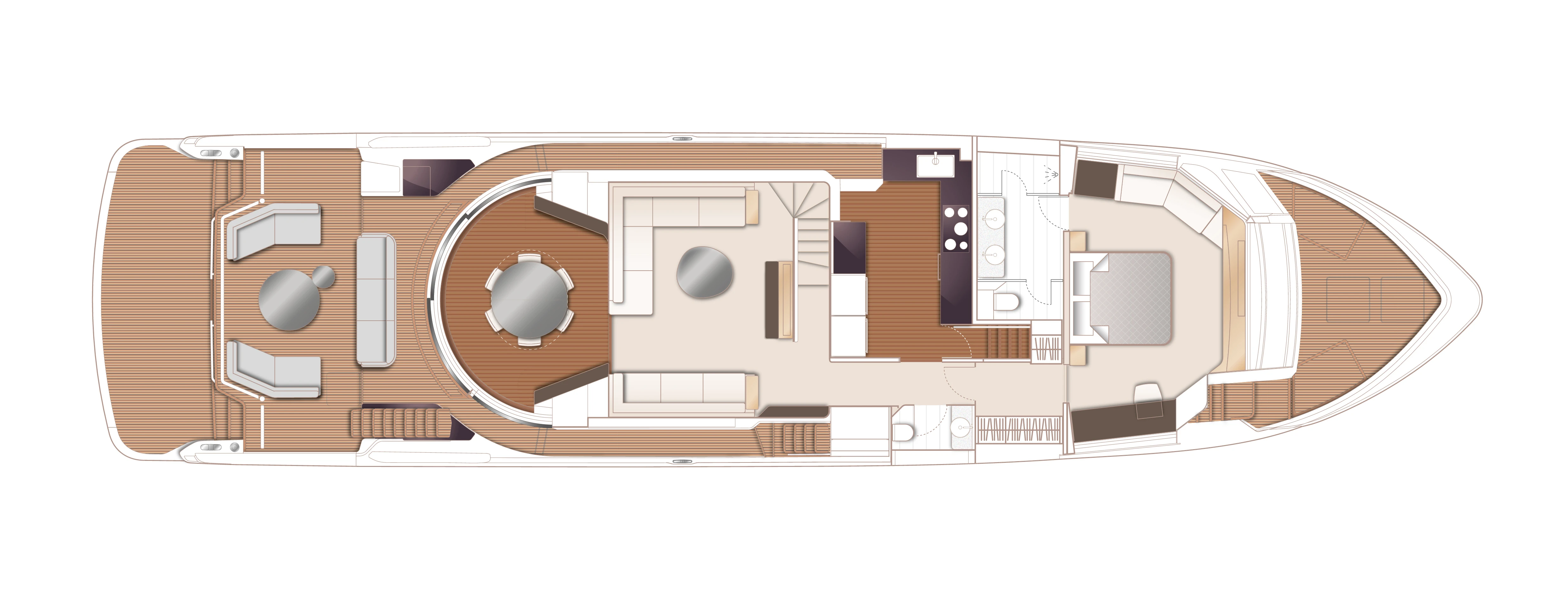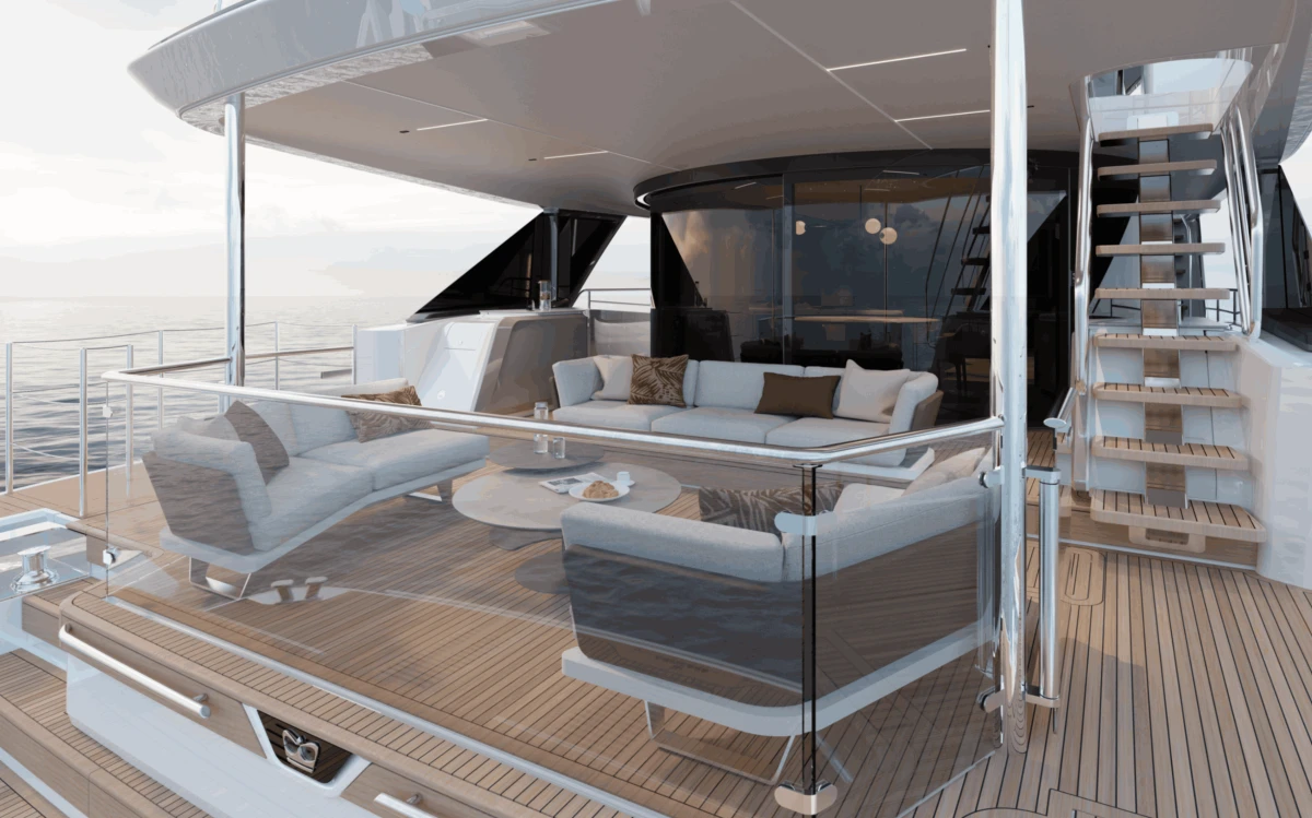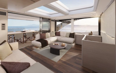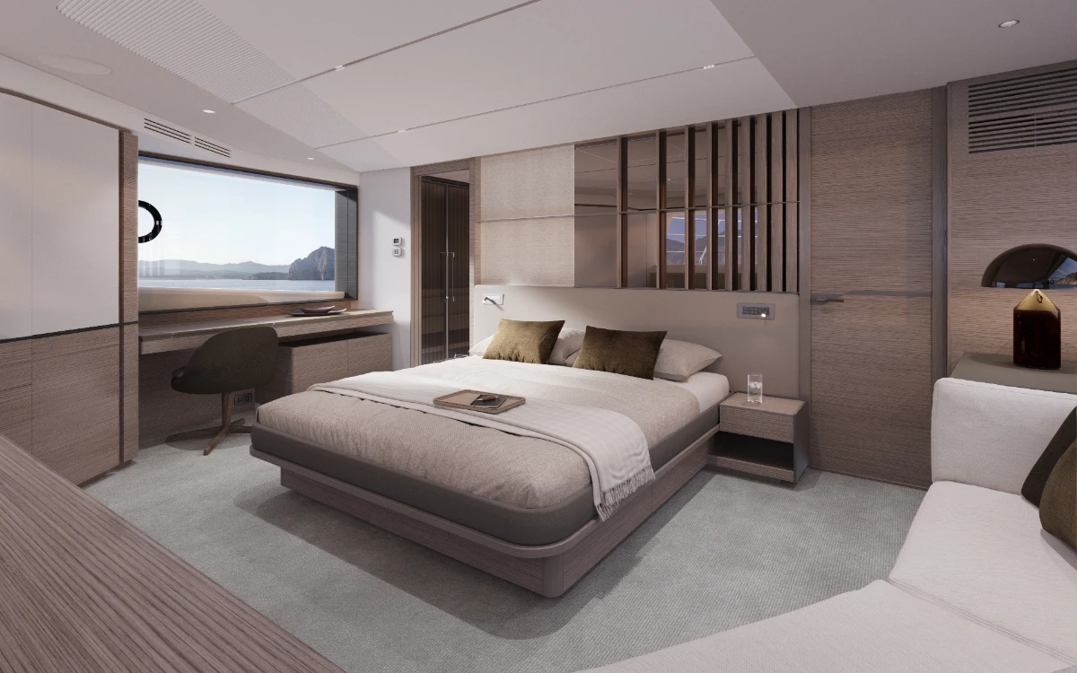 A full-beam master suite on the main deck offers panoramic 180° views and optional private access to the foredeck terrace. The enclosed Skylounge with optional 85-inch TV, shaded flybridge dining, and flexible aft deck layout ensure every journey is tailored to you.