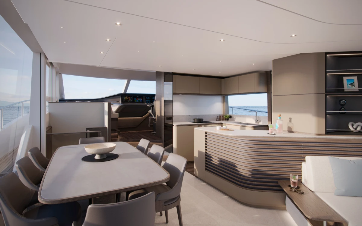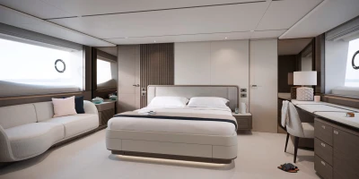 Offering a generous beam, the Y80 provides significant volume for an 80-foot motor yacht, whilst retaining elegant styling and design, both inside and out. The voluminous main deck offers an uninterrupted flow through from cockpit to the helm area, combined with panoramic views from the vast windows through-out the saloon. There is a seamless connection of each zone, from living area to dining arrangement, from well-equipped galley to day head, through to the wheelhouse with helm station and companion seating.