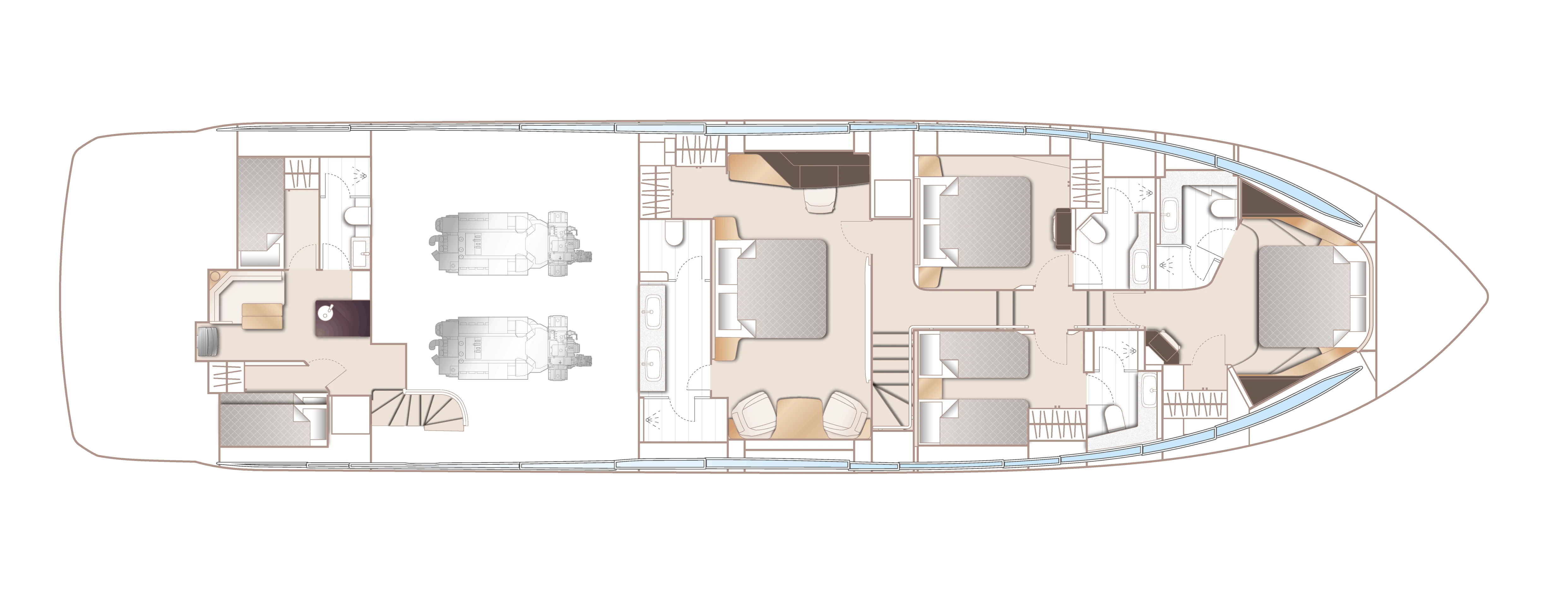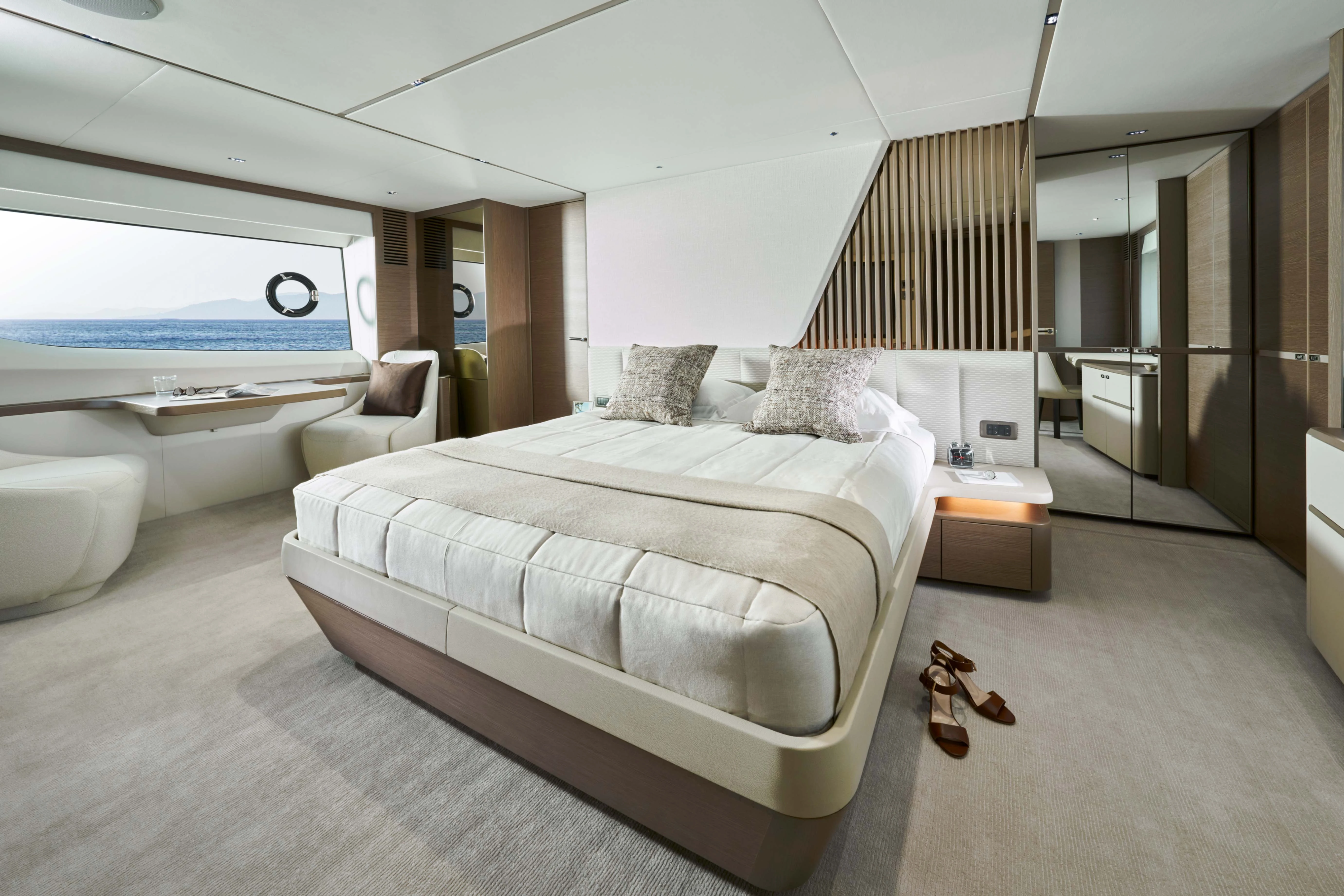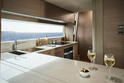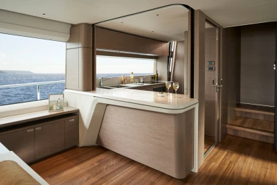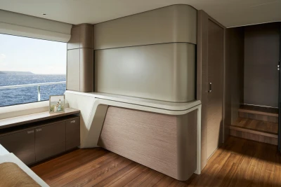 Her single-level main deck offers expansive undisturbed views, opening you and your guests to the world surrounding you. The journey through the main deck can be personalised to suit your needs, with a sliding door to the galley and an elegant electronic divider over the bar that transforms the space from open and sociable to intimate and closed. Below deck, four ensuite cabins can sleep up to 8 guests supported by class-leading separate crew quarters, with two crew cabins and a crew mess. The superior master cabin makes full use of the Princess Y85’s full width with natural light flooding the room and a large ensuite bathroom attached. Throughout the yacht, technology is state-of-the-art with Naim audio system featuring as standard throughout the cabin and main deck spaces.