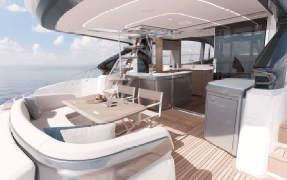 Aft, you are met with her teak laid Electro-hydraulic bathing platform and a garage to store a tender of up to 3.3m, with electro-hydraulic door and tender launch system with electric winch. The cockpit features U-shaped seating and dining area with folding teak table, and aft sunpad. A cockpit countertop to port connects to the galley countertop separated by an upswinging door which, when open, seamlessly connects the inside with the outside. There is an optional top-loading cool box, storage cupboard and to starboard there is also the option for either a servery unit, including 100l drawer fridge and bilge locker, or an L-shaped aft facing seat including bilge locker.