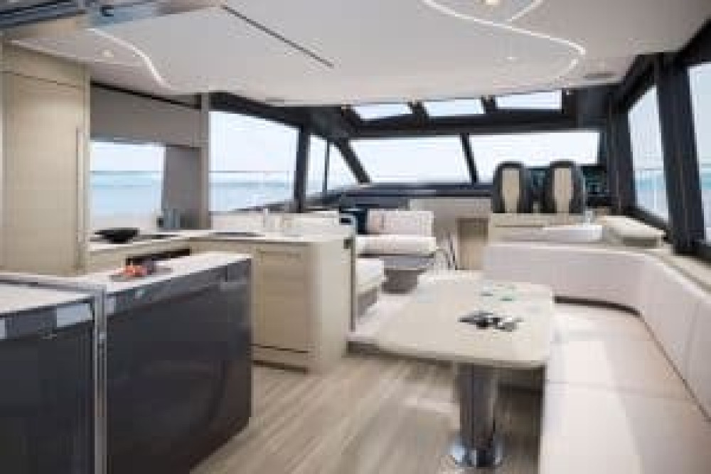 Moving inside, the sociable deck saloon offers a versatile environment to kick back and relax, featuring a U-shaped sofa with crockery drawers, coffee table, and sideboard unit with bottle and glass storage, providing sufficient places to store kitchen and homeware. Opposite the saloon seating area is a 55" UHD LED TV on rise and fall linked to Marine audio system to provide a state-of-the-art entertainment system. Looking forwards, the dinette features an L-shaped sofa with folding dining table and cup holders, plus a stainless-steel framed sliding door to the cockpit with integrated hinging window aft of the galley. The well-equipped open plan galley seamlessly connects to the saloon, featuring a full height fridge/freezer and twin sinks.