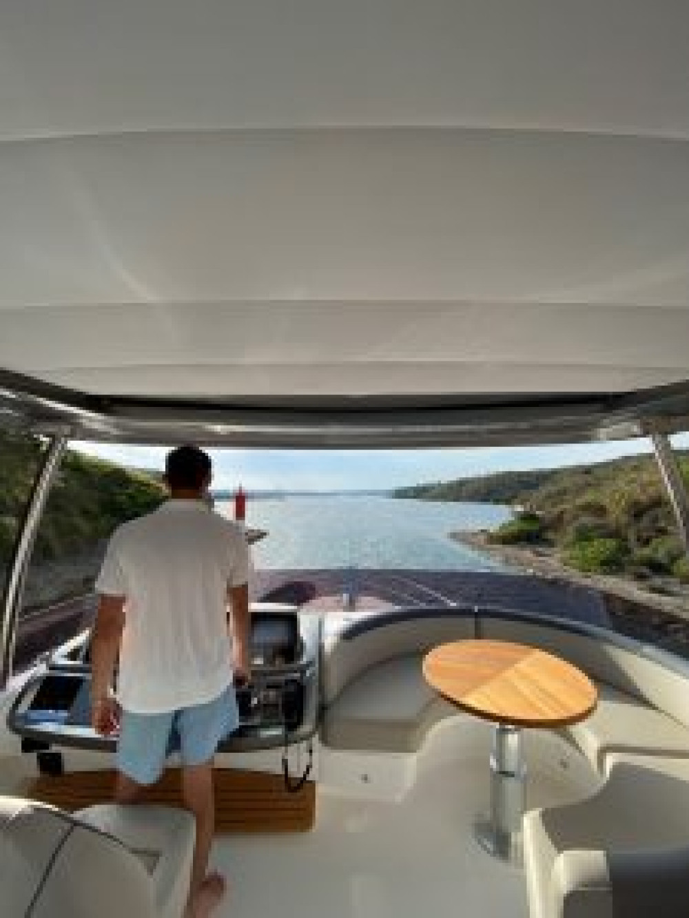 We considered the S62 with the smaller sport fly and the sunroof above the lower helm. But because of the weather in Mallorca, we pretty much live on the flybridge so we really wanted the extra space and flexibility of the F62. There's a big upper dining area and bar, plus a convertible second table for overflow and a master sunbed at the back. When you've got ten or 12 people on board, that's just fantastic.